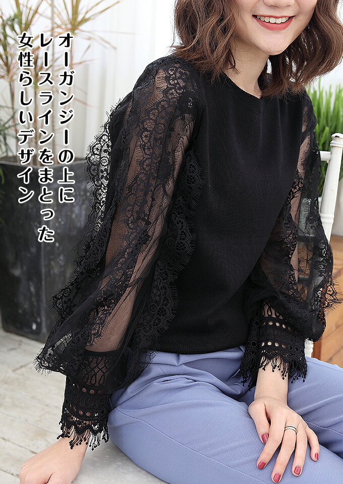 【即納】ニット トップス レディース クルーネック 柄 白 ホワイト グレー ベージュ 黒 ブラック ネイビー レース オーガンジー パフスリーブ 【 ケミカルレース バルーン袖 ニット切り替えトップス 】【春 新作】【2019年1月新作 トップス 】